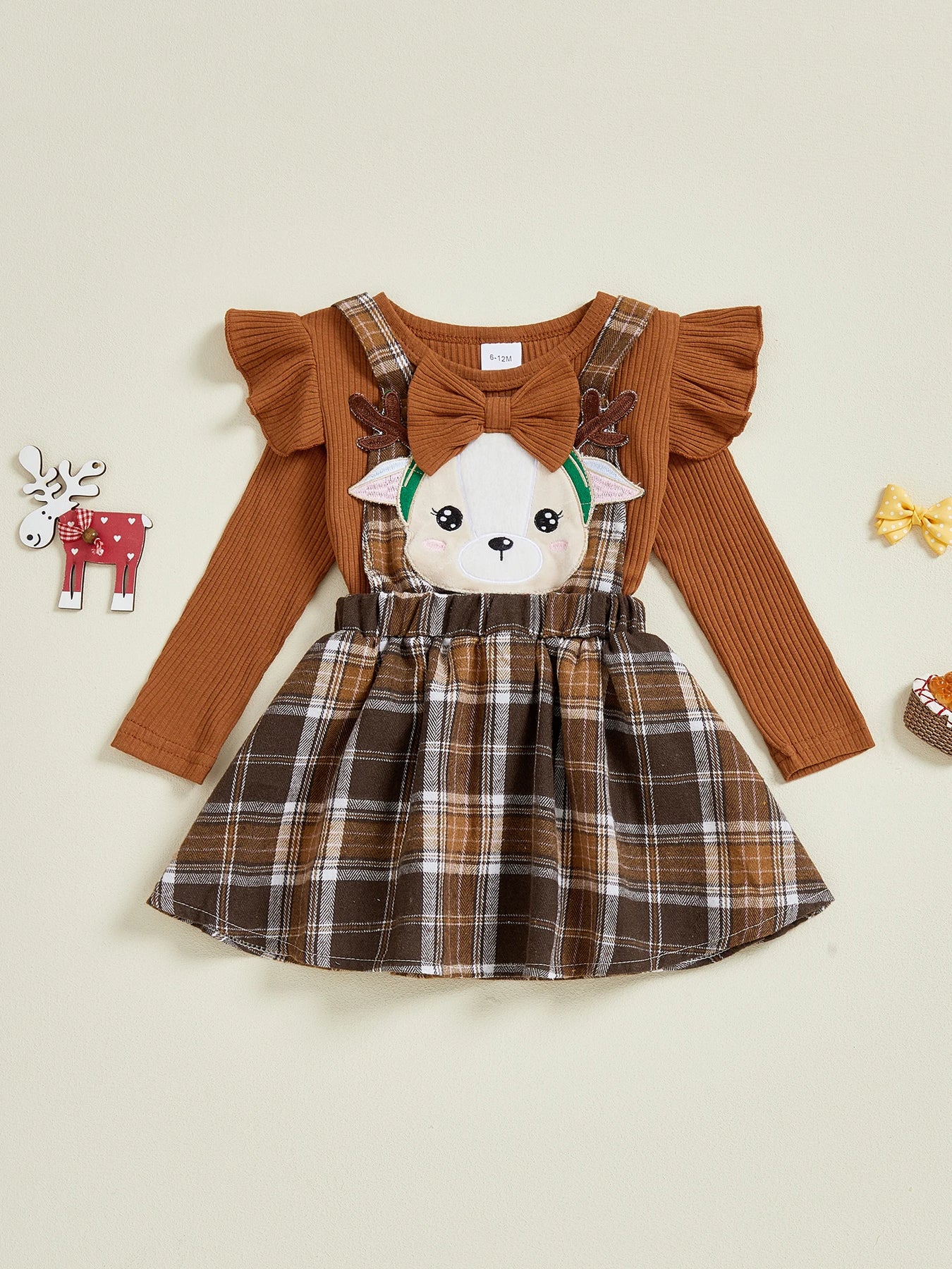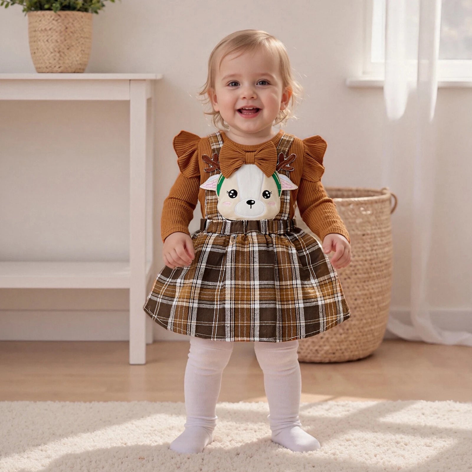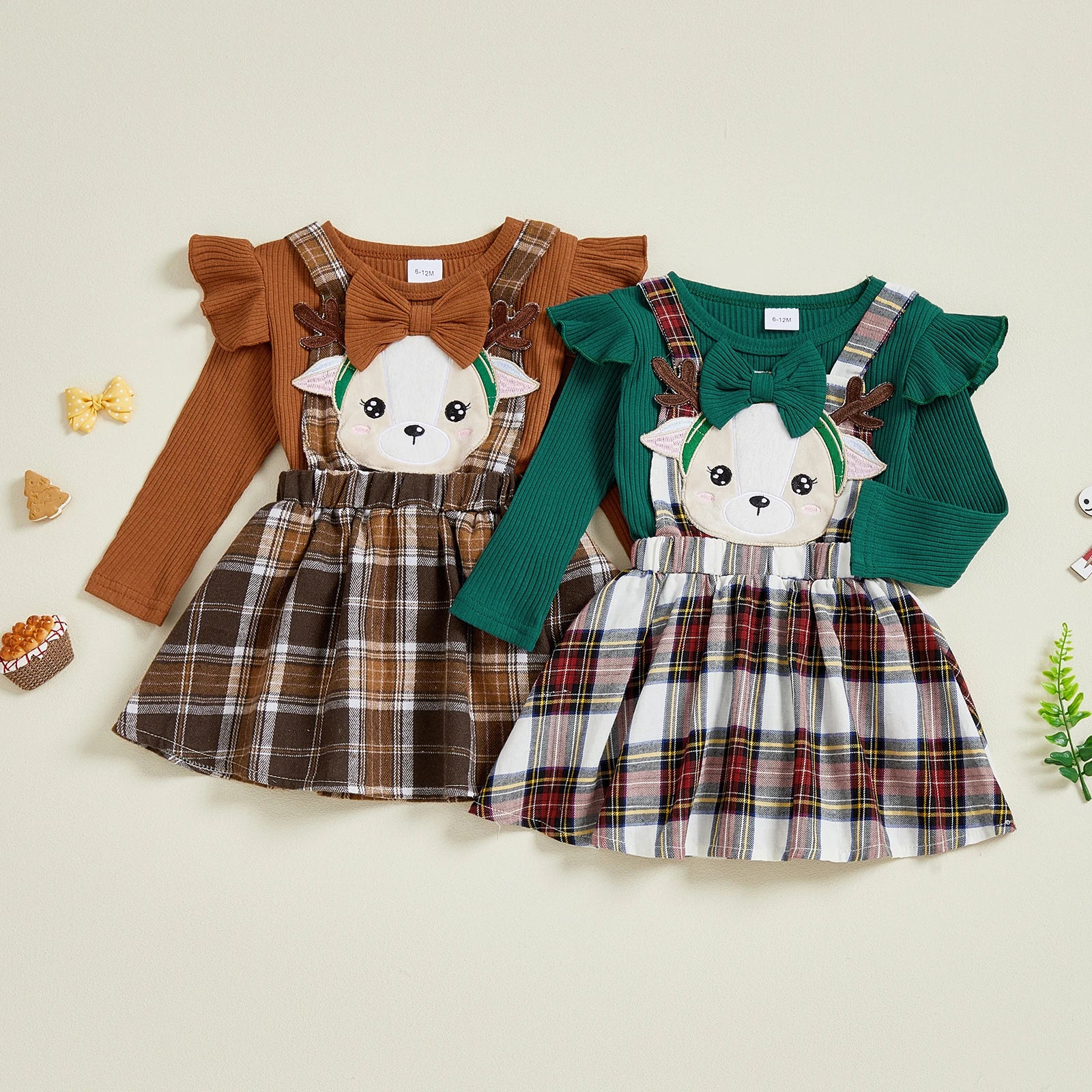 Świąteczna sukienka dziewczęca w kratę z reniferkiem